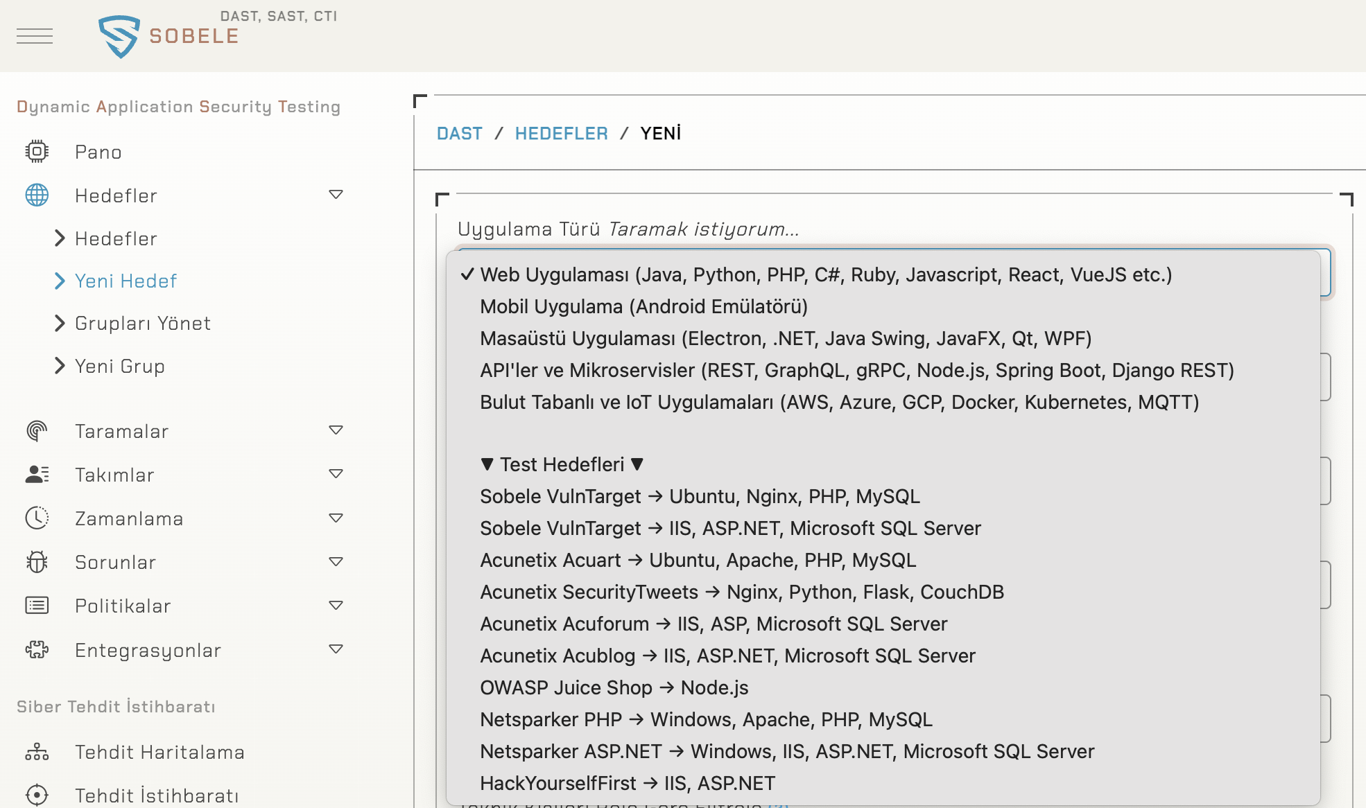 Sobele'de yeni hedef ekleme sayfası, çeşitli uygulama türleri için optimize edilmiş güvenlik testi hedefleri oluşturmanıza olanak tanır. Akıllı form yapısı ile farklı teknolojilere uygun yapılandırma seçenekleri sunar.
